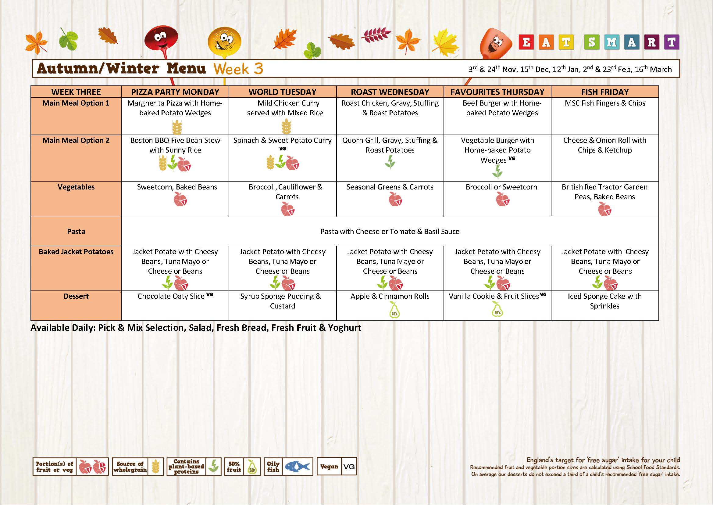 Our diverse menus include a wide variety of options to suit all tastes and are based on feedback from pupils, staff, the catering team, parents and guardians. We run a three-week menu cycle that changes twice a year.